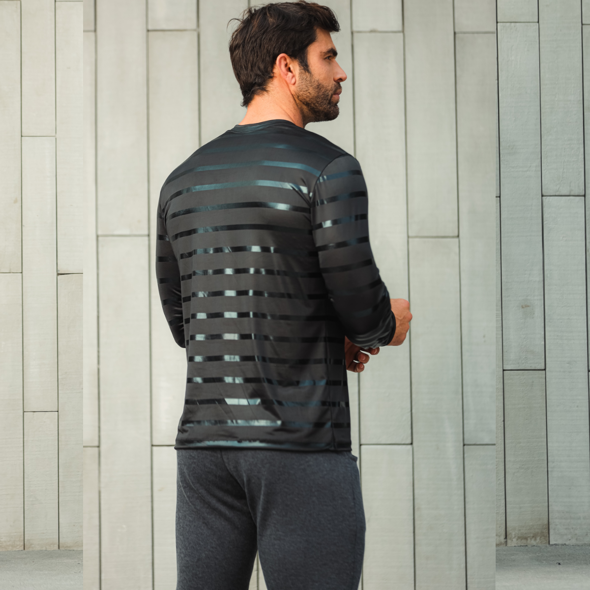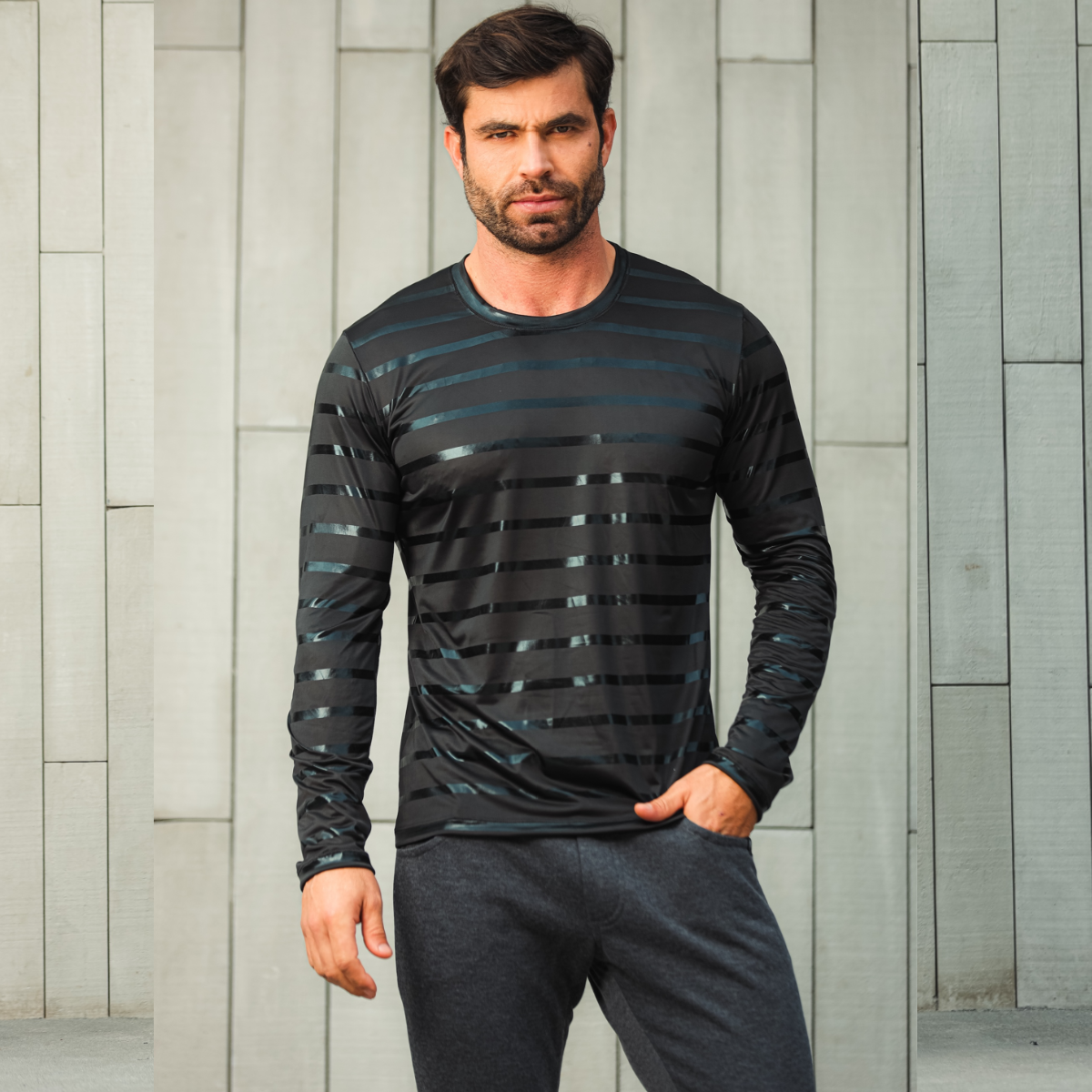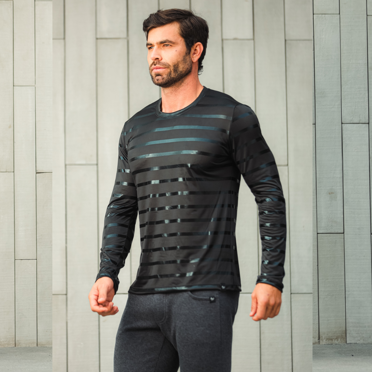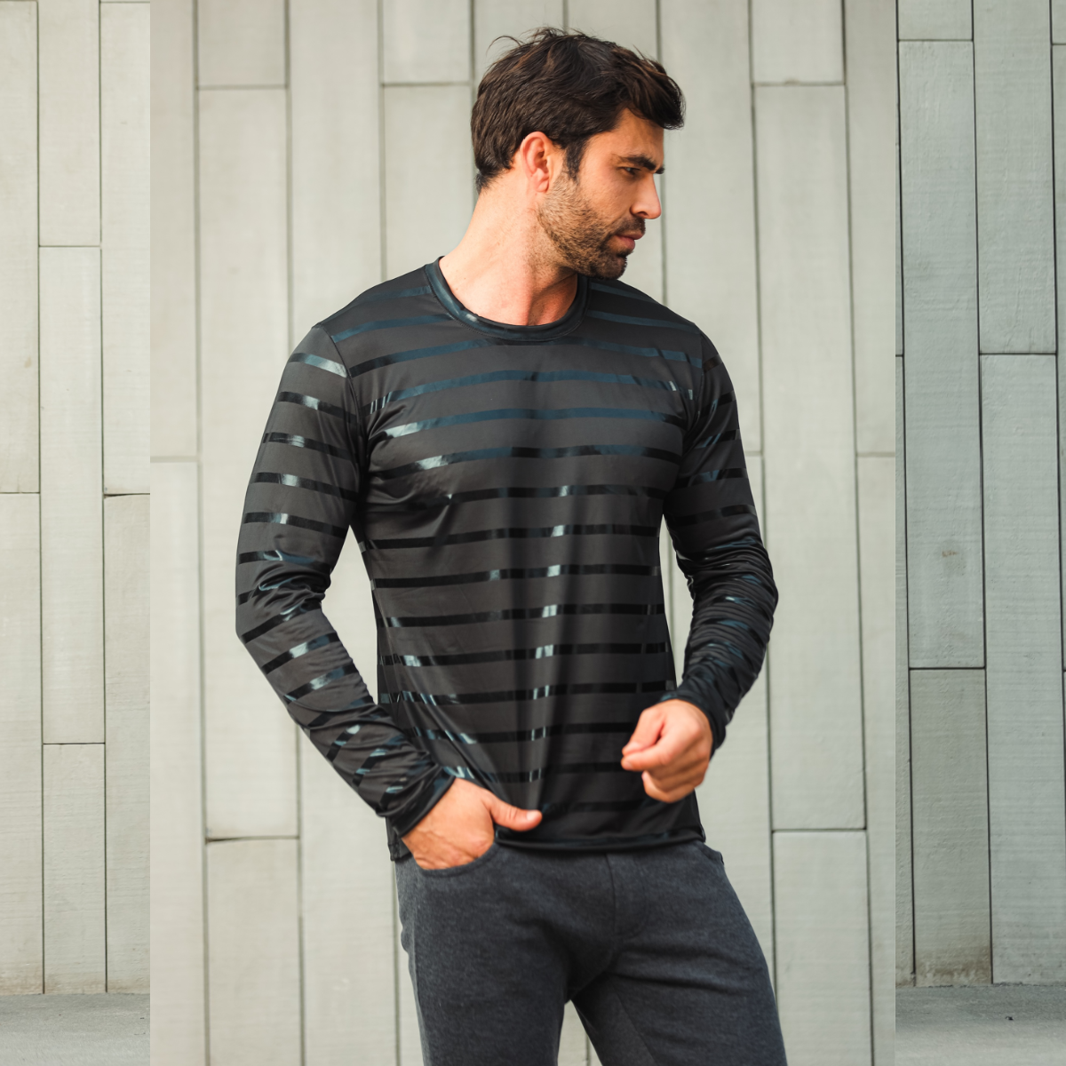 "Subtle shine, striking presence" – redefine elegance with modern allure. Step into the night with the Men’s Long Sleeve Sheer Stripe Shine T-Shirt, a refined statement piece designed for those who appreciate sophistication with a touch of glamour. Its lightweight sheer mesh is enhanced by delicate shimmering stripes, creating a luminous effect that is bold yet tasteful. Perfect for upscale evenings, parties, and occasions that demand effortless style, this piece blends sensuality with contemporary class.