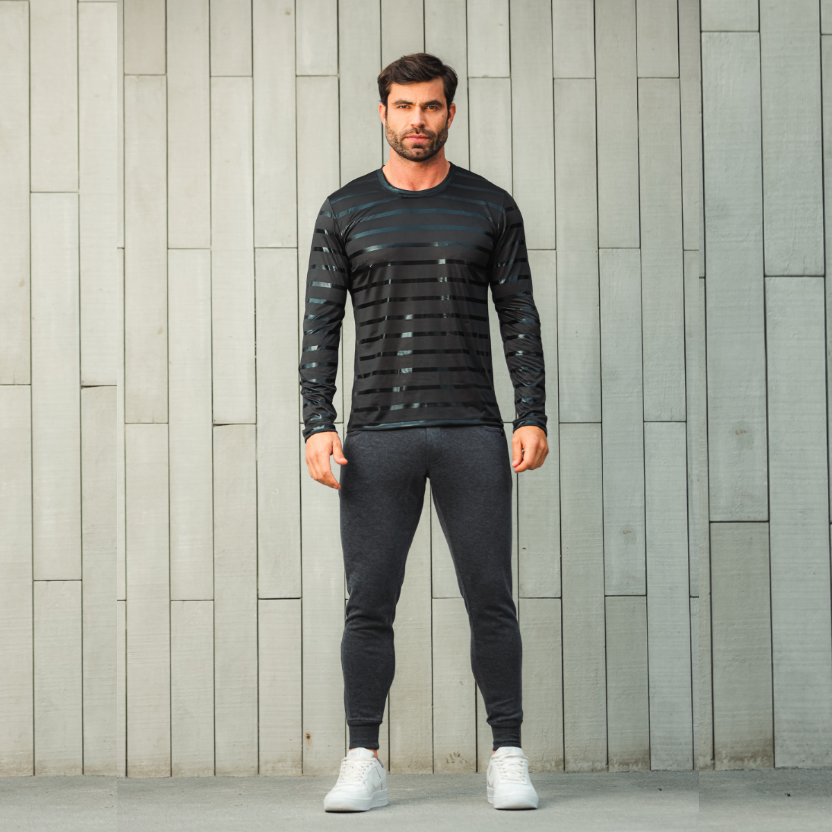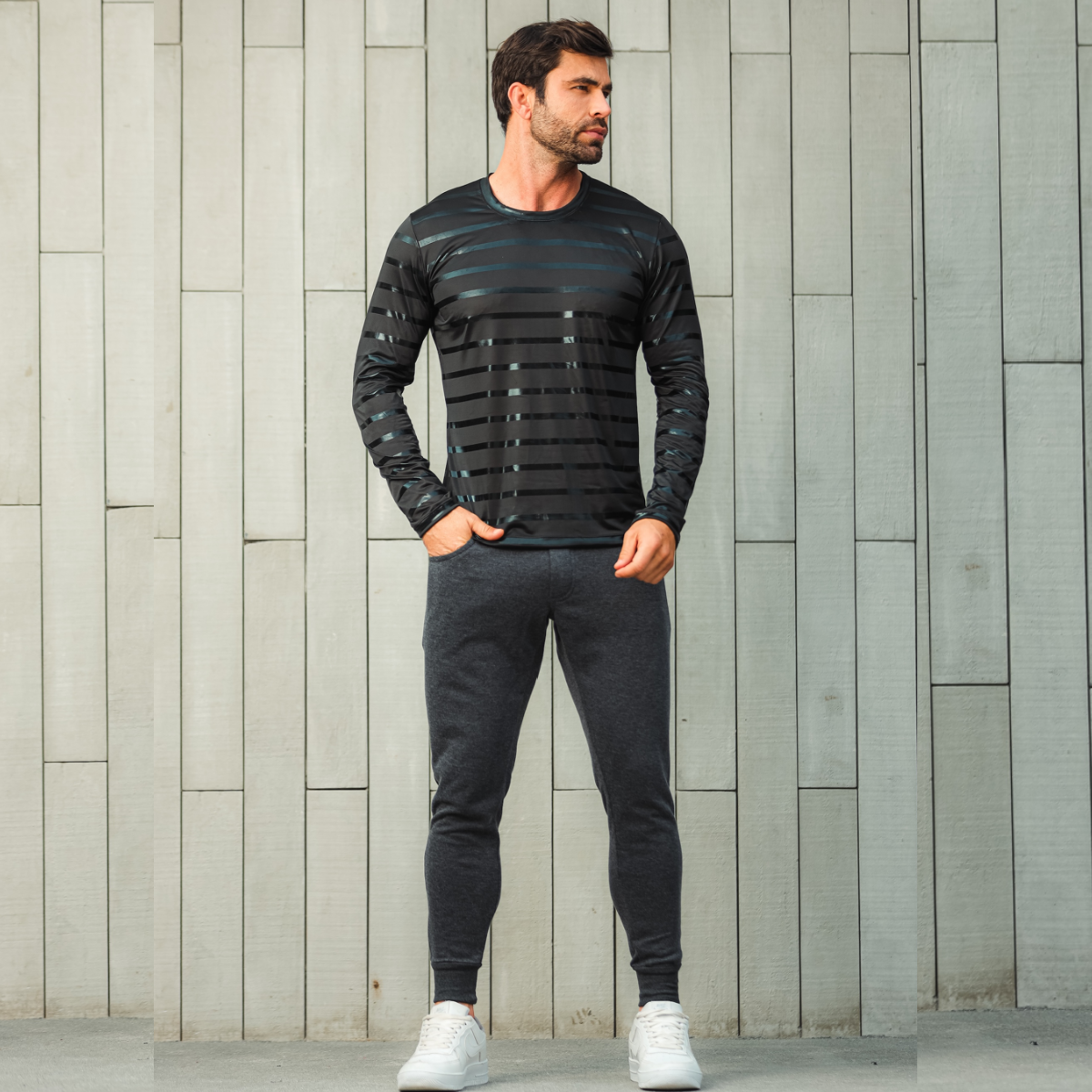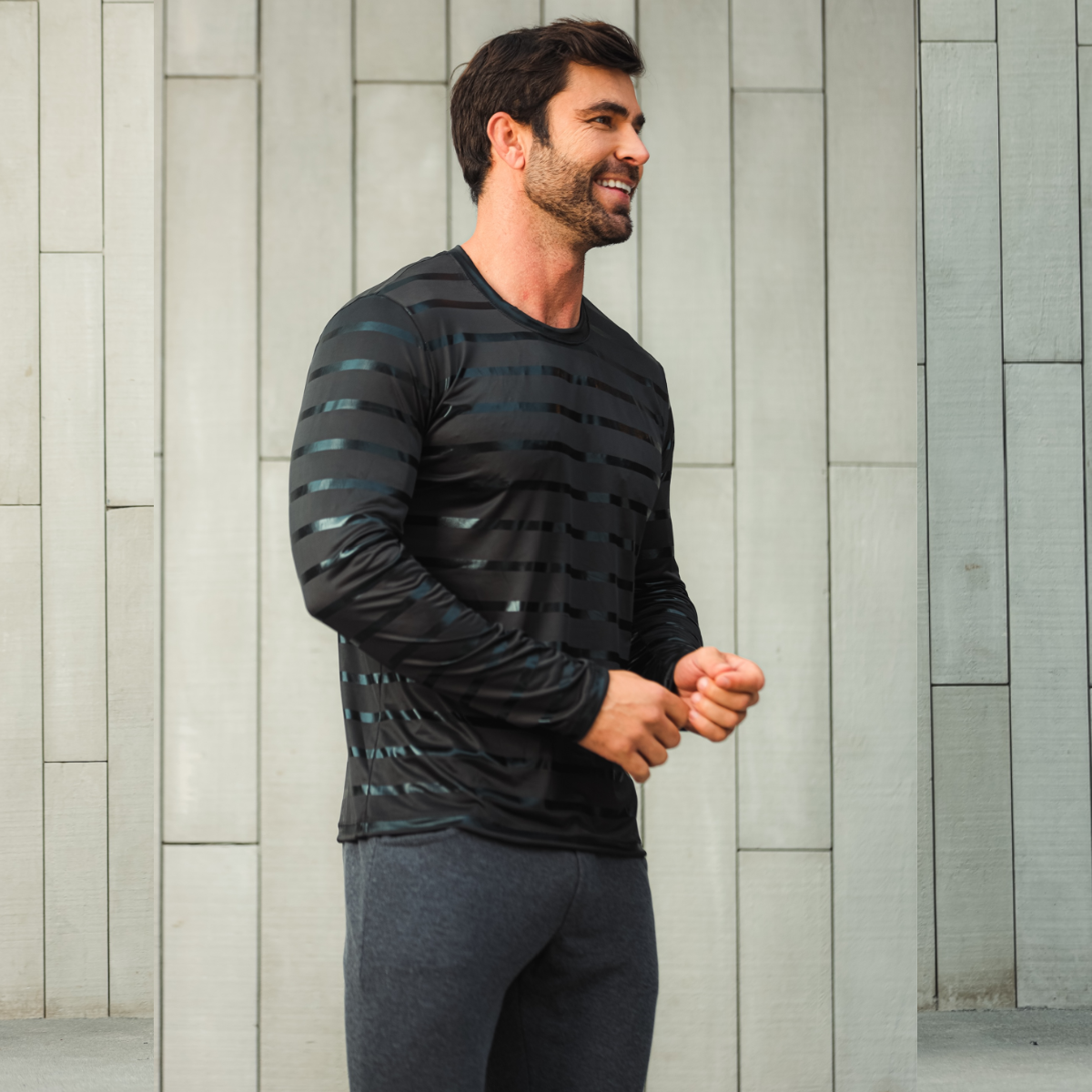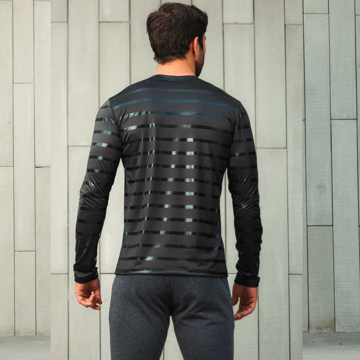 "Subtle shine, striking presence" – redefine elegance with modern allure. Step into the night with the Men’s Long Sleeve Sheer Stripe Shine T-Shirt, a refined statement piece designed for those who appreciate sophistication with a touch of glamour. Its lightweight sheer mesh is enhanced by delicate shimmering stripes, creating a luminous effect that is bold yet tasteful. Perfect for upscale evenings, parties, and occasions that demand effortless style, this piece blends sensuality with contemporary class.