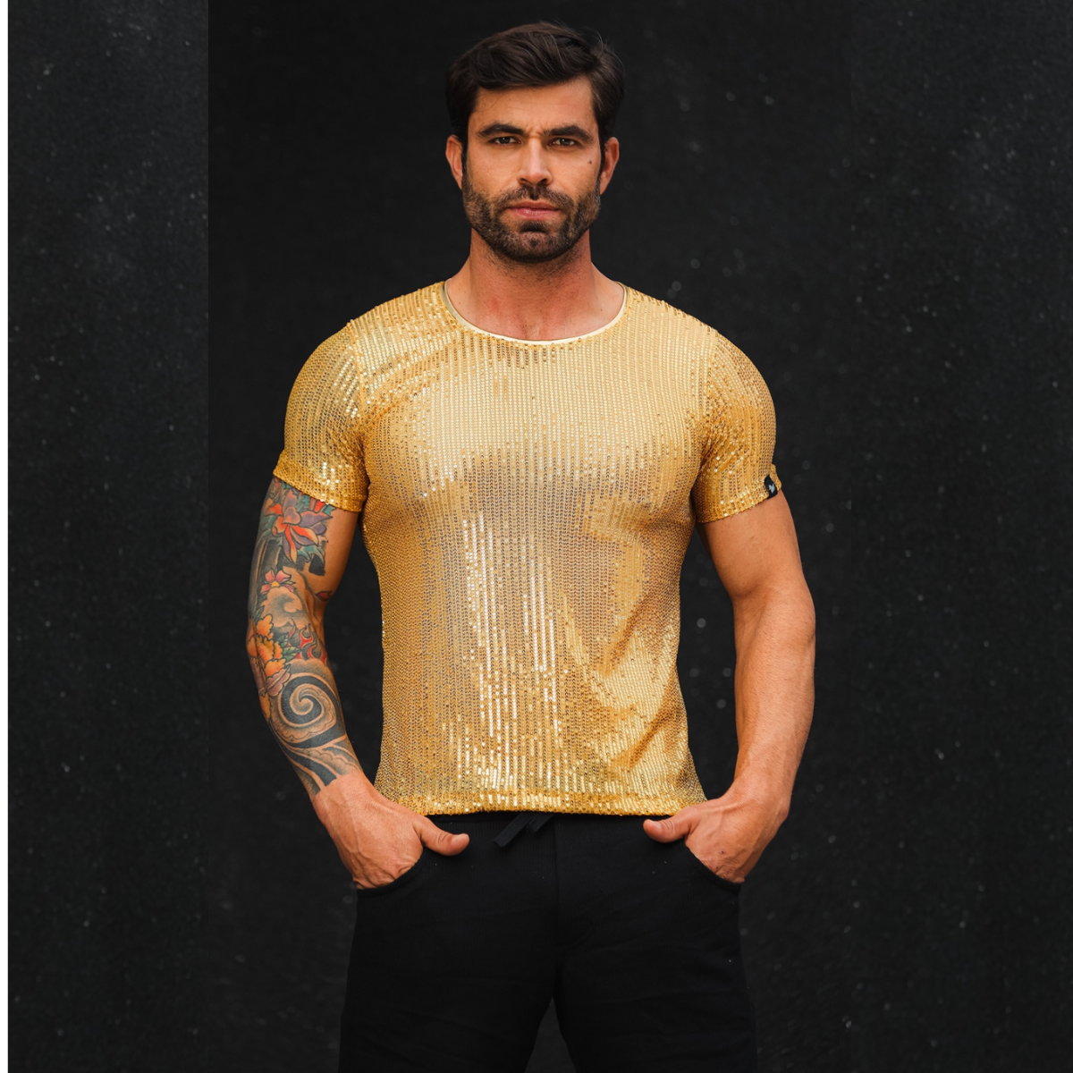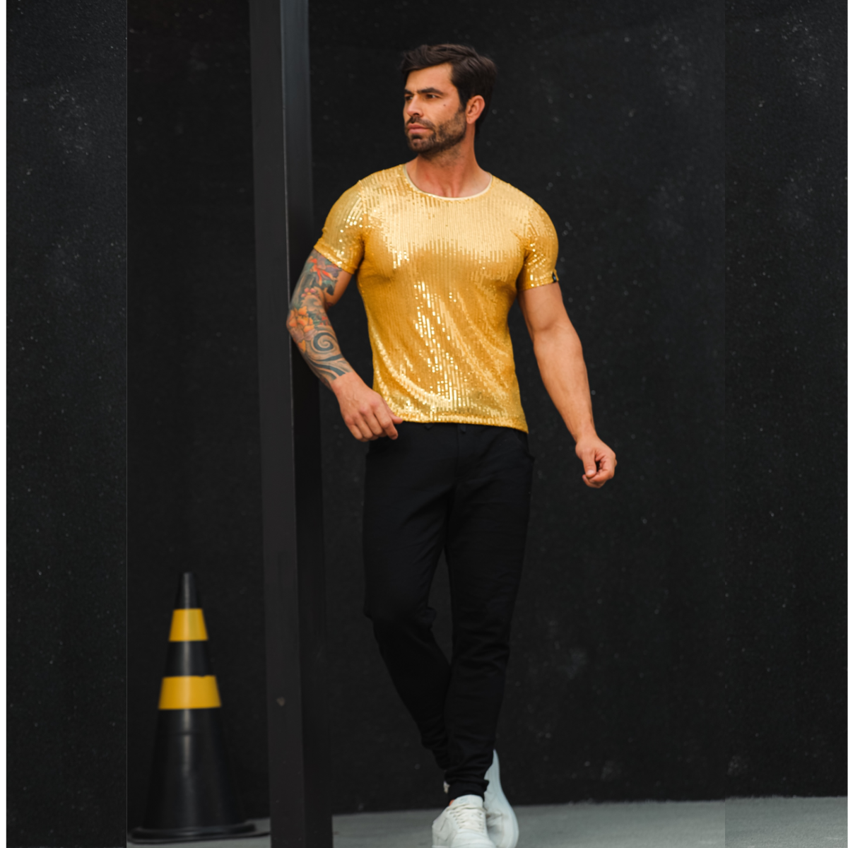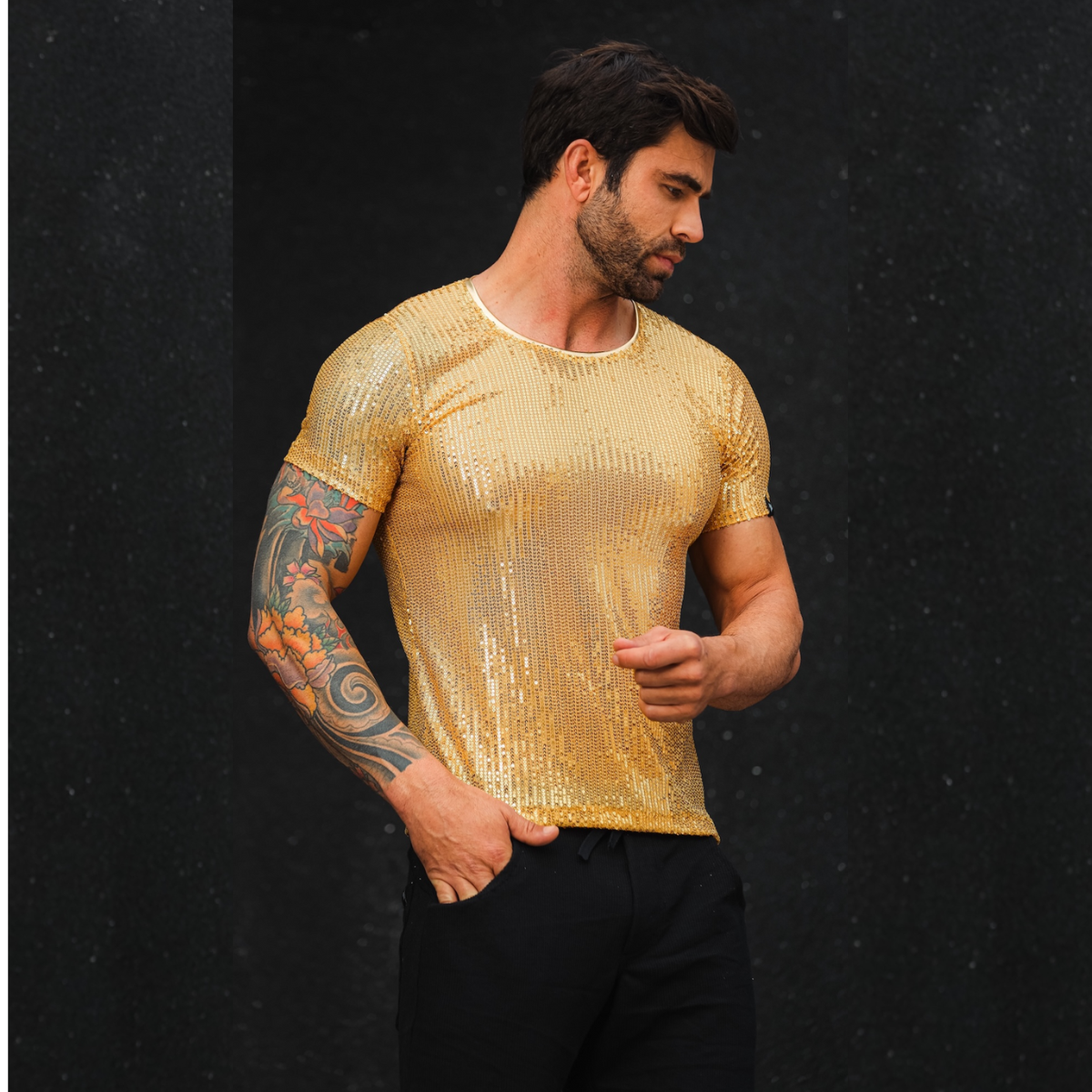 Make a bold statement with luxury and attitude. This gold sequin t-shirt is designed for those who love to stand out, featuring a high-shine, premium sequin finish that catches every glimmer of light with sophistication and style.