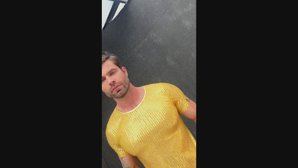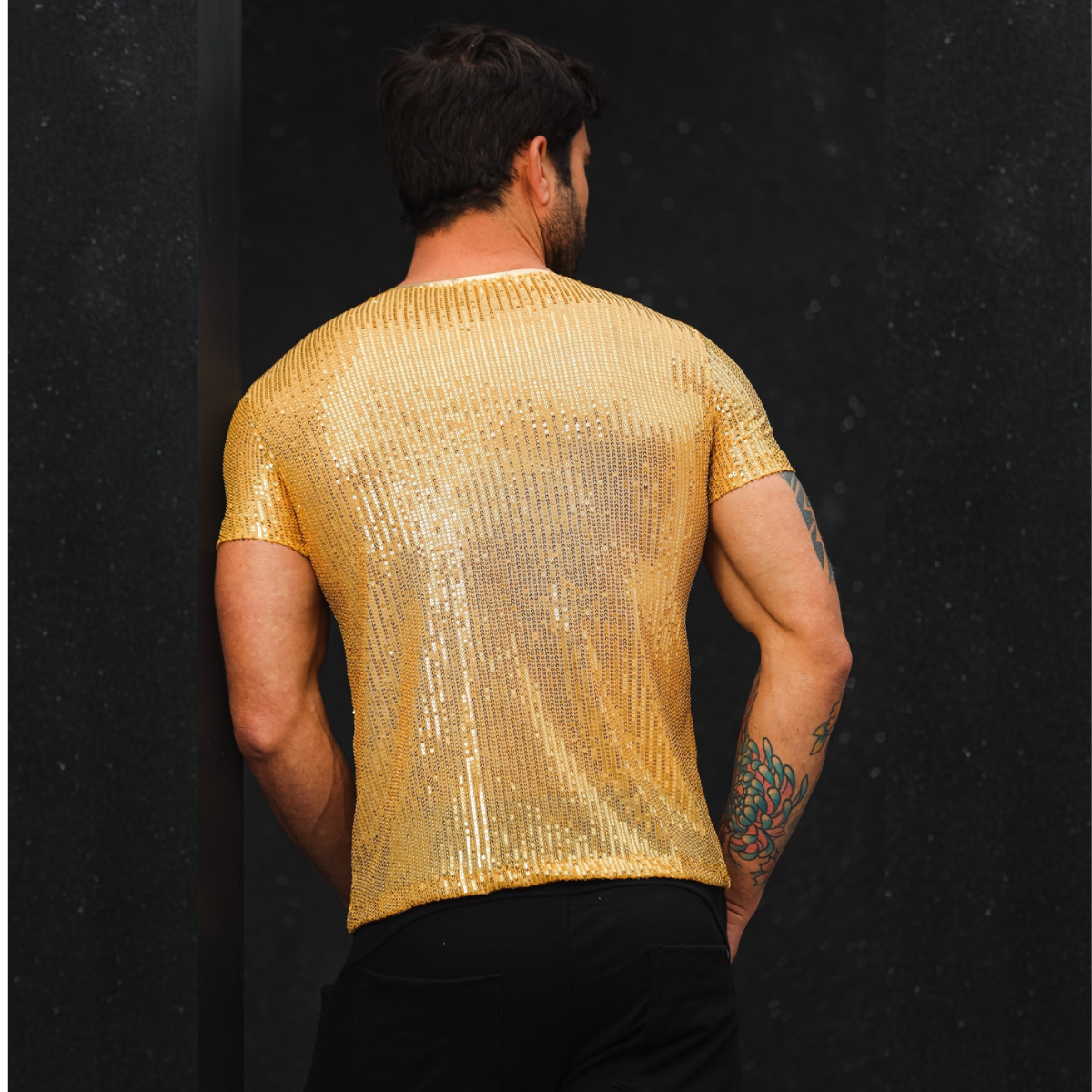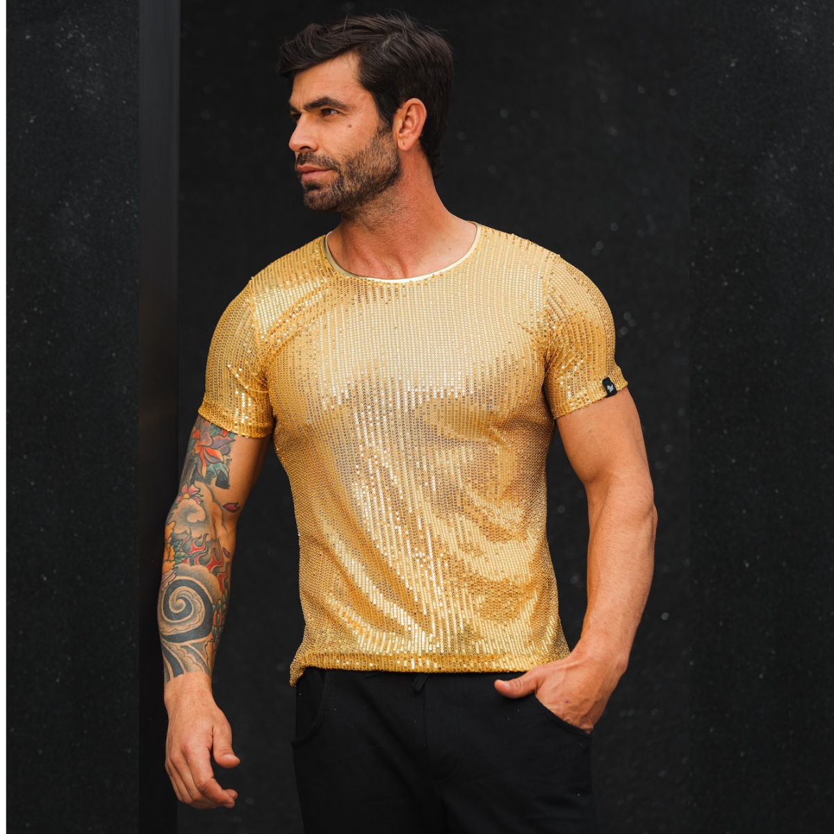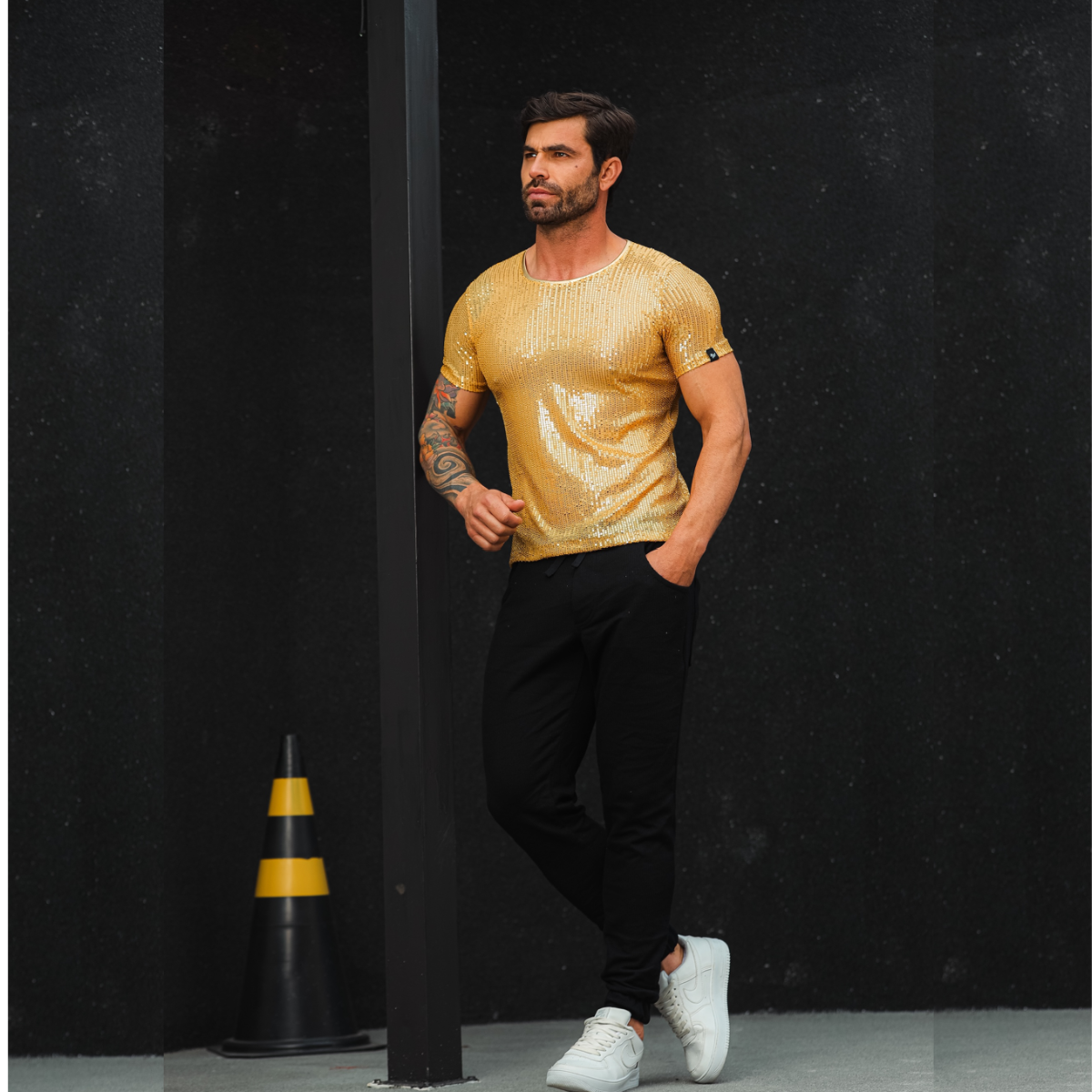 Make a bold statement with luxury and attitude. This gold sequin t-shirt is designed for those who love to stand out, featuring a high-shine, premium sequin finish that catches every glimmer of light with sophistication and style.